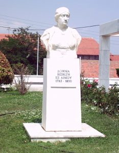 Domna Visvizis was from Aimos, a maritime city in Eastern Thrace. Coming from a wealthy family, she married the wealthy ship owner and brave energetic visionary Antonios Visvizis who was one of the first members of the “Filiki Eteria”. Domna herself later was initiated into the secret association.